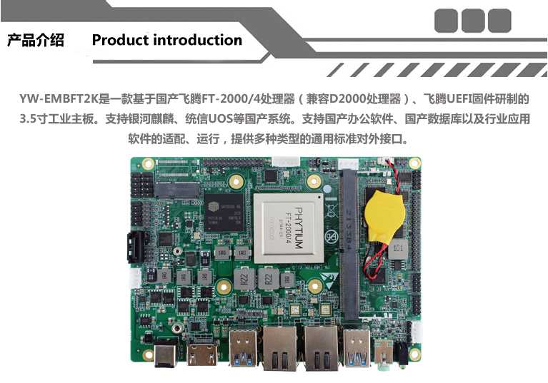 YW-EMBFT2K采用飛騰FT-2000/4四核處理器,同時兼容飛騰D2000八核處理器,主頻2.6GHz。支持2個RJ-45接口、6個串口、6個USB2.0接口、4個USB3.0接口、2個M.2插槽(支持WIFI/SSD),可根據不同應用場景進行靈活配置,實現擴展、升級需要。支持寬溫寬壓,滿足客戶各種環境下的使用需求。
